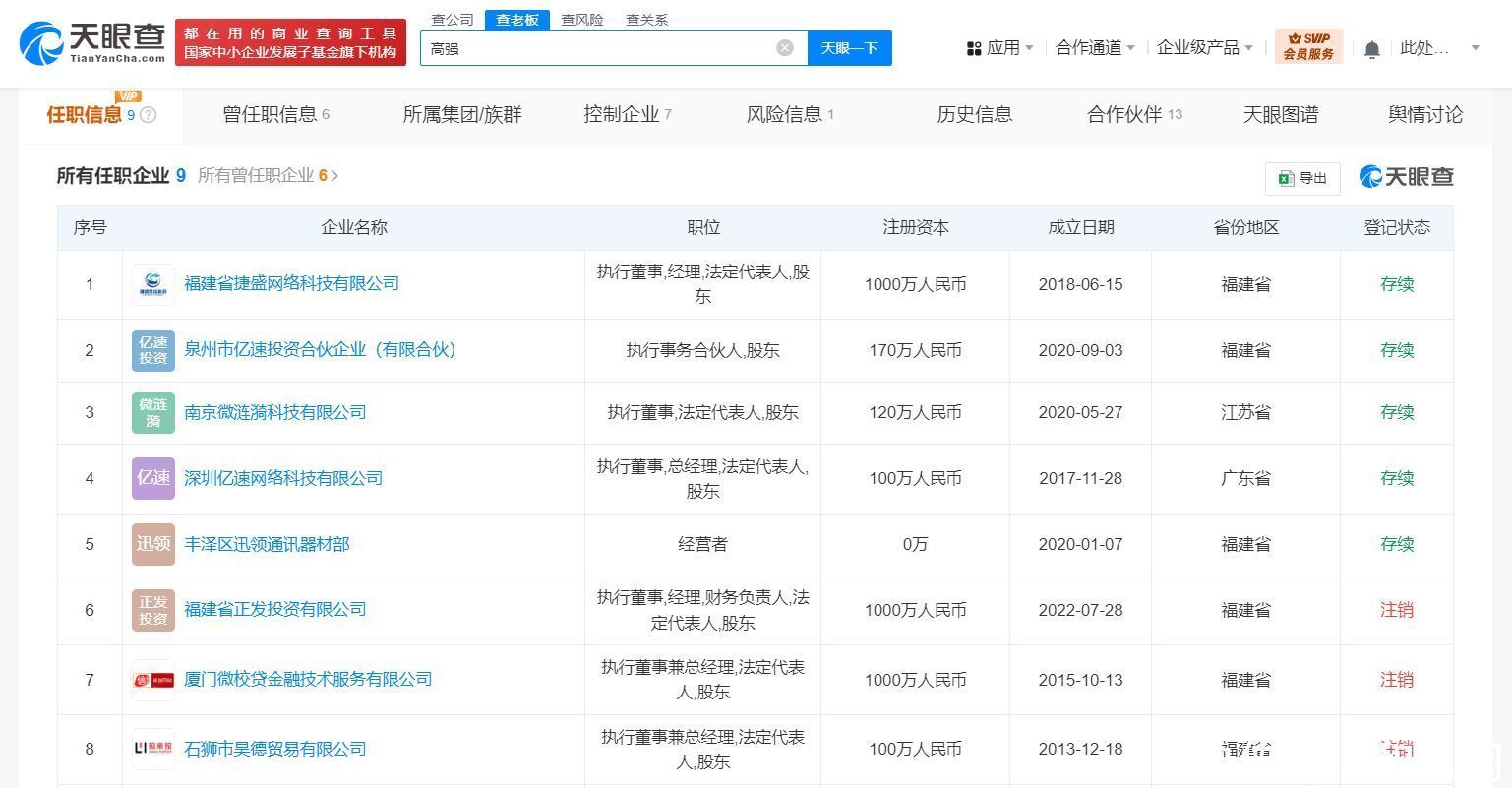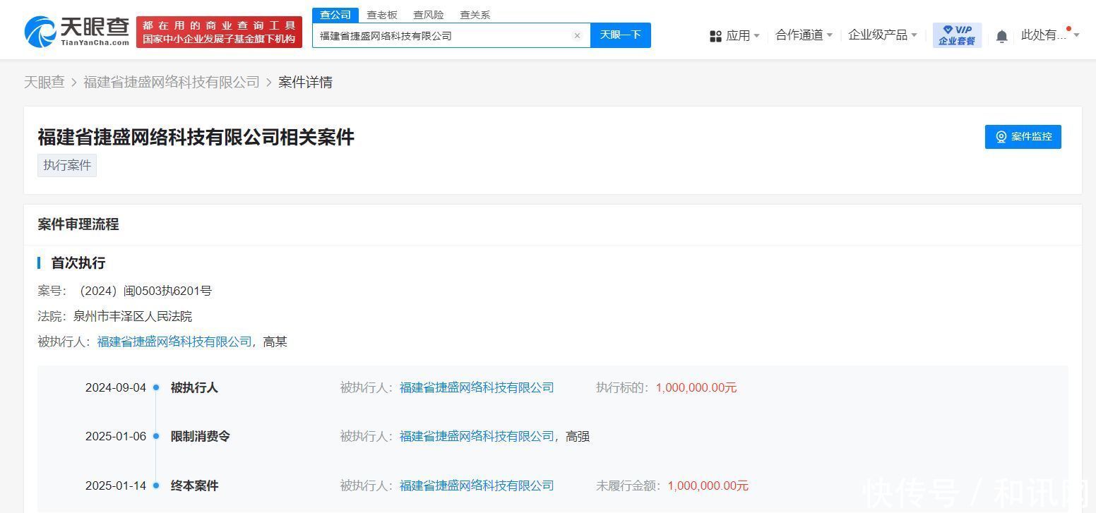 天眼查显示,该公司实控人高强名下有5家存续企业,包括福建省捷盛网络科技有限公司、泉州市亿速投资合伙企业(有限合伙)、南京微涟漪科技有限公司等。值得注意的是,今年1月,高强及名下福建省捷盛网络科技有限公司因未按执行通知书指定的期间履行生效法律文书确定的给付义务,被泉州市丰泽区人民法院限制高消费。案件流程信息显示,去年9月,福建省捷盛网络科技有限公司因该案件被执行100万元。