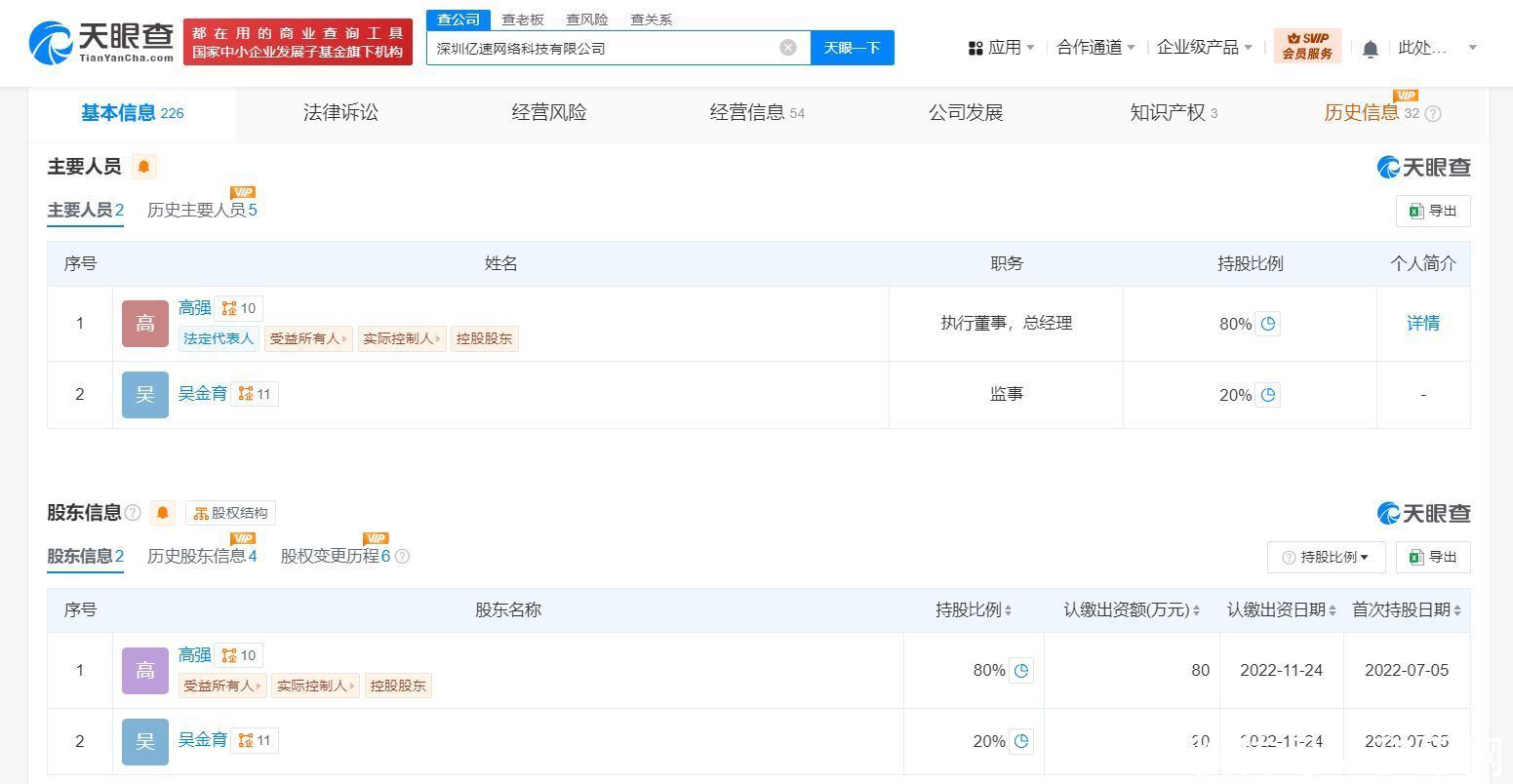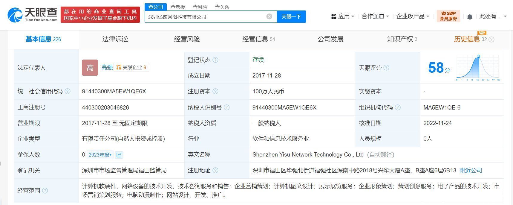 天眼查App显示,深圳亿速网络科技有限公司成立于2017年11月,法定代表人为高强,注册资本100万人民币,经营范围含计算机软硬件、网络设备的技术开发、技术咨询服务和销售,企业营销策划,计算机图文设计,展示展览服务,企业形象策划,市场营销策划服务等。股东信息显示,该公司由高强、吴金育共同持股。